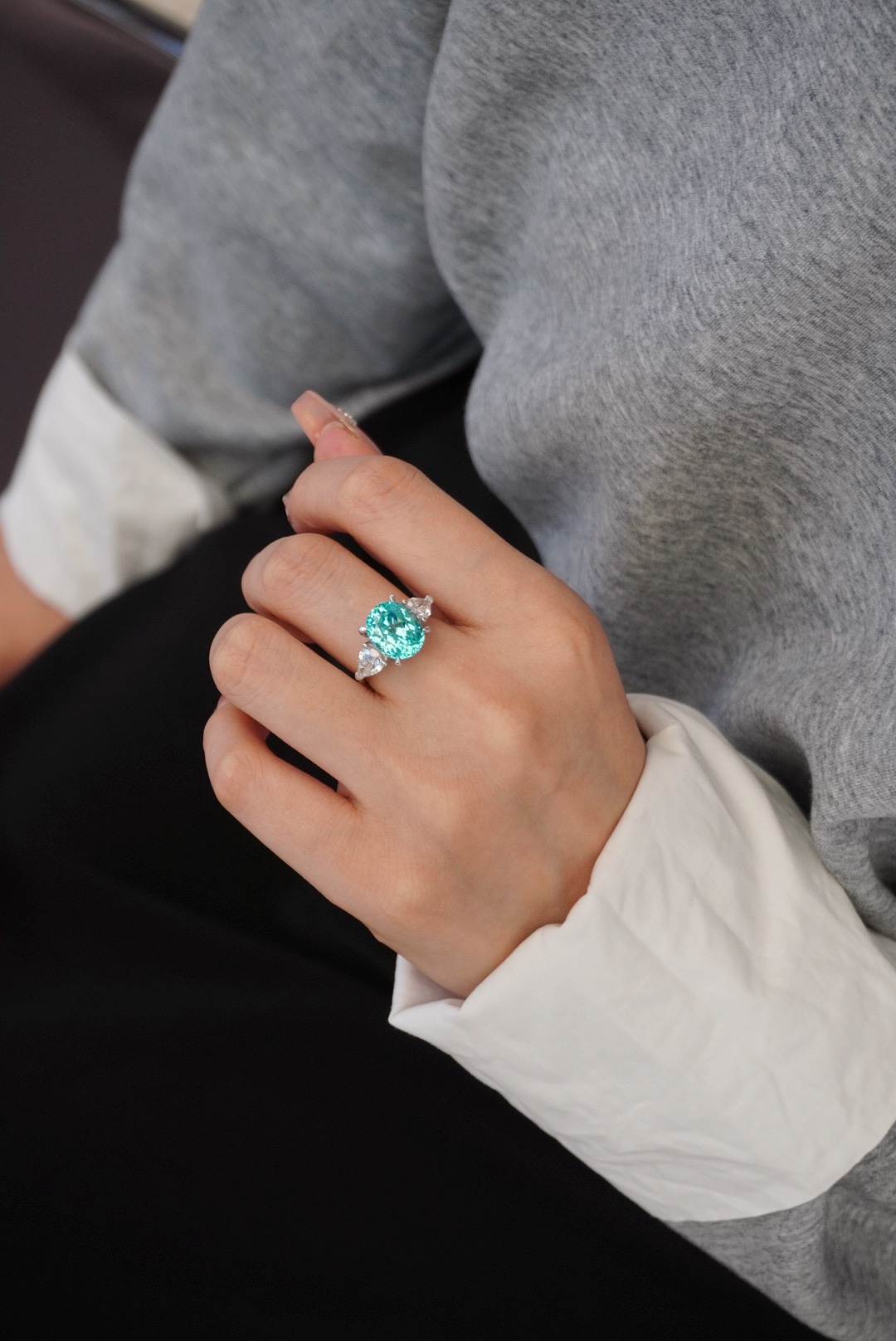 The classic three–stone model, the main stone is over 8 carats, the effect is not ostentatious at all, the ring wall is thick, and the overall texture is superb